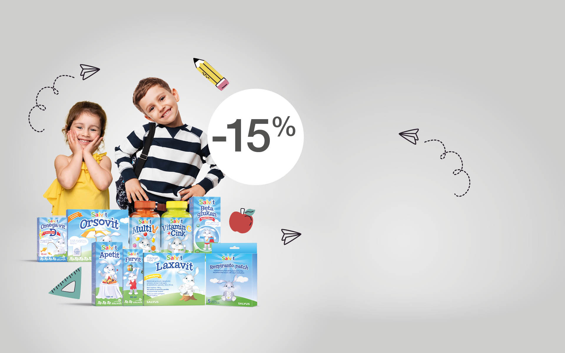 *Popust se odnosi na dječji asortiman: Salvit Apetit 150 ml, Salvit Beta Glukan 150  ml, Salvit Fervit 30 ml, Salvit Laxavit A16, Salvit Multiv Žele Bomb A60, Salvit Omega-vit D kapi 15 ml, Salvit Orsovit Prašak A6, Salvit Respiranto Flaster A5. Popust isključuje posebne ponude i pakete.