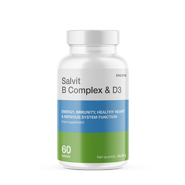 Salvit B Complex & D3 tablete sadrže savršenu mješavinu 9 vitamina – vitamine tiamin, B2, niacin, pantotenska kiselina, B6, B7 (biotin), B9 (folna kiselina), vitamin B12 i PABA te vitamina D3 za dodatnu podršku. Tiamin, B2, niacin, pantotenska, B6 i B12 pridonose normalnom metabolizmu stvaranja energije.