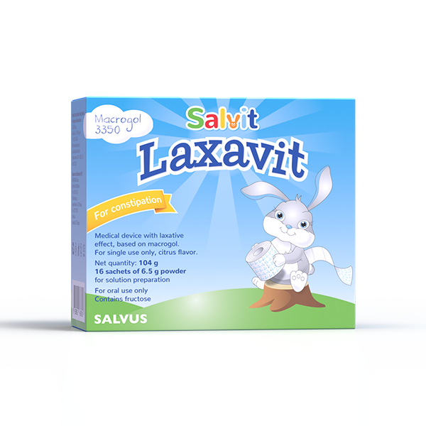 Salvit Laxavit je medicinski proizvod na bazi Makrogola 3350, koristi se u slučajevima kronične konstipacije i neredovitog pražnjenja crijeva. Zahvaljujući osmotskom učinku Makrogola 3350, koji ima visoki afinitet vezanja vode i omekšavanja stolice, ubrzava rad i olakšava pražnjenje crijeva na prirodan način. Ne apsorbira se niti metabolizira u crijevima, ne fermentira u crijevima, ne iritira sluznicu te se eliminira stolicom u neizmijenjenom obliku. Može se koristiti već od 6 mjeseci života. Odličnog je okusa citrusa.