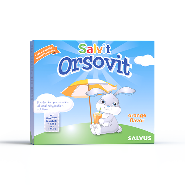 Značajan udio u našem tijelu čini voda, prosječno oko 55%, dok je kod djece ona u tijelu prosječno zastupljena oko 70%. Voda ima mnogo važnih funkcija, primjerice regulira temperaturu tijela, utječe na probavu i izlučivanje otpadnih tvari putem znoja i urina. Djeca su sklonija dehidraciji nego odrasli, jer, u odnosu na odrasle, imaju veću površinu kože i tako više gube vodu putem znojenja 1. Salvit Orsovit je prašak za pripremu oralne rehidracijske otopine. Namijenjen je za dijetalnu prehranu bolesnika s gubitkom elektrolita i vode kod proljeva te za rehidraciju. Sadrži tindalizirane bakterijske kulture Lactobacillus acidophilus. Ugodnog okusa naranče.